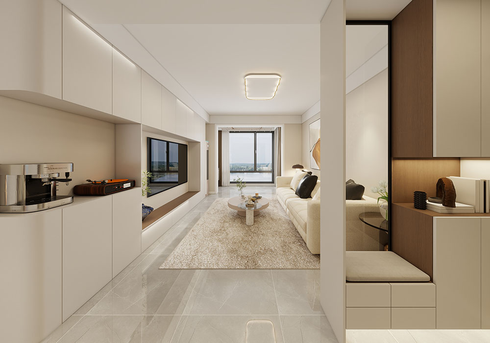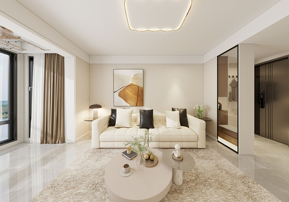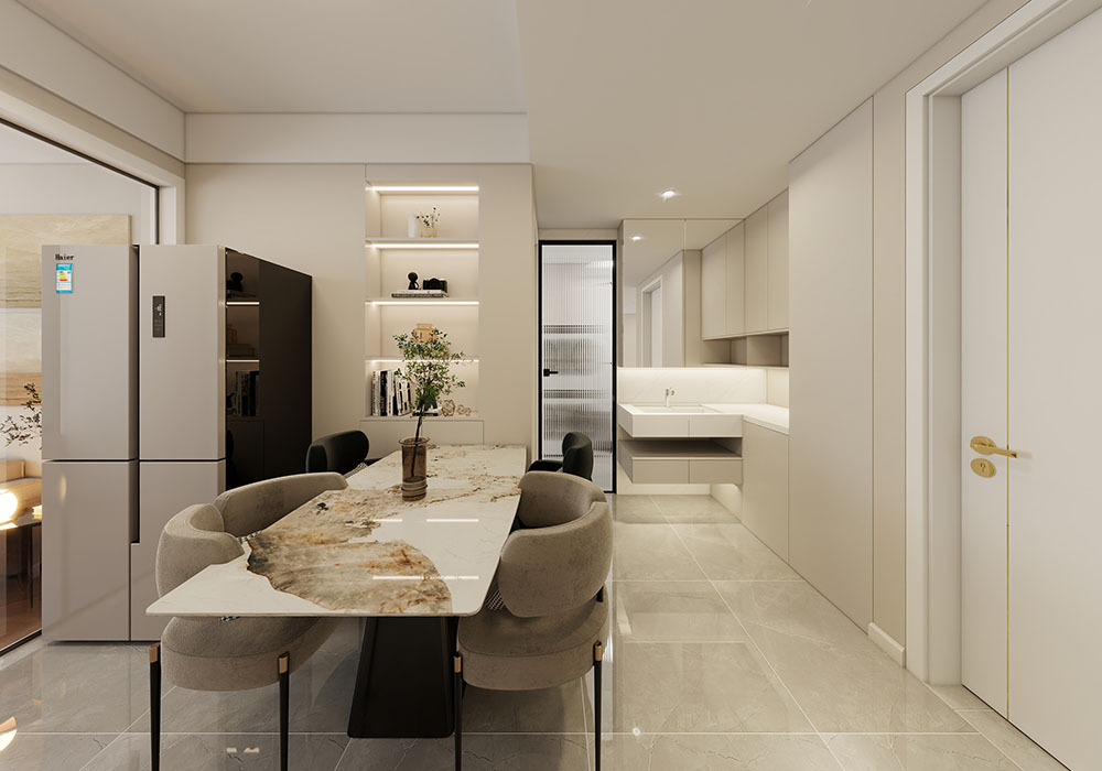 业主喜欢独特有设计感的空间,偏爱现代轻奢风格。我们主要通过强调低调内敛的奢华与明快舒适的现代感并存,高档的材质、精致的细节和精心挑选的家具共同营造出典雅的氛围。 我们对功能区的划分做了比较大的更改,首先卫生间通过合理的布局做了干湿分离,同时儿童房增加了储物空间,其次适当的将一部分主卧的面积改为餐厅,空间的动线更加合理,最后儿童房使用了墨菲床,与客厅用移门轨道隔开,空间整体感更强。