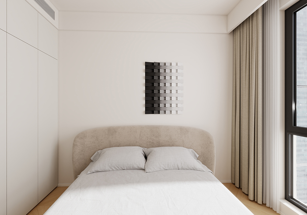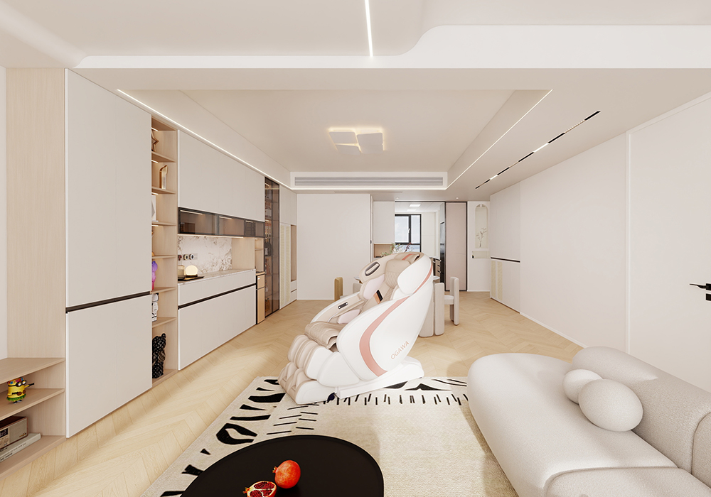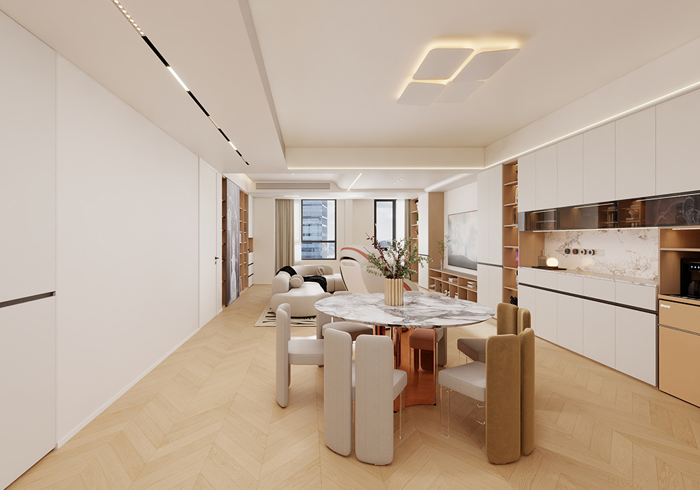 该方案设计注重空间的开放件与实用性。强调简约、自然的家具设计。要尽量避免过多的装饰和复杂的线条,以简洁的造型和柔和的线条为主,同时,融入人性化的设计理念,满足业主的生活需求和审美喜好。 本设计以白色为主色调,搭配少量的木色,营造出简洁大方、舒适自然的居住氛围。白色的运用使空间更加明亮开阔,木色的运用使空间更加温暖自然,搭配感的不规则挂画、质感柔软的沙发以及低饱和的色彩,这些材质柔软且富有质感,能够很好地烘托出温馨氛围。家居的灯光设计也至关重要,通常采用暖色调的灯光来营造温馨舒适的氛围。通过暗藏灯带、筒灯、射灯等组合使用,实现全屋的均匀照明和重点照明。开放式客餐厅,以增加空间的通透感和流动性。